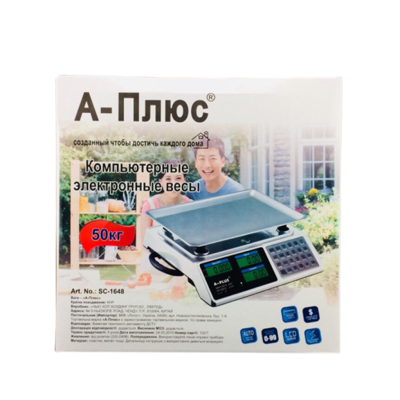 Торгові комп'ютерні ваги 1648. Такі ваги використовуються для зважування різних предметів і, звичайно, продуктів харчування, у різних сферах виробництва та обслуговування (торгівля, харчування, побут). Торгова вага оснащена двома дисплеями для зручності. Один екран для персоналу з клавіатурою, інший для клієнта.Діапазон ваги торгової ваги від 5 гр до 50 кг. Торгові ваги працюють від вбудованого акумулятора 6V/4Ah або від мережі 220V. Завдяки стійкості до температурних умов торгові ваги можуть використовуватись у торгівлі на вулиці будь-якої пори року.