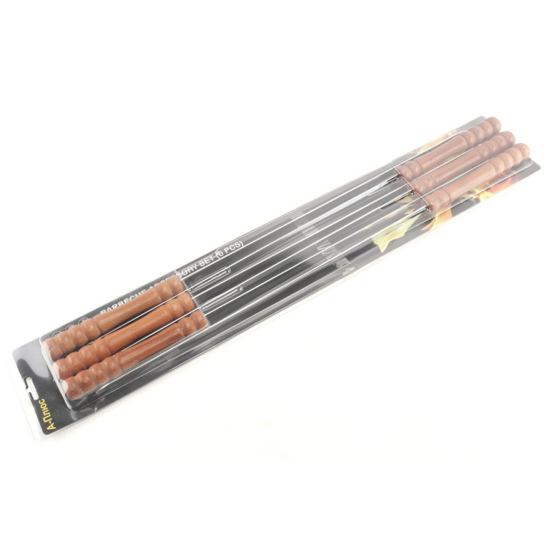 Набір шампурів для гриля виготовлений із харчової нержавіючої сталі високої якості шириною 10 мм та товщиною 2 мм із дерев'яною ручкою. Цей метал не вступає в реакцію з їжею під час експлуатації, а значить не змінює її смак та запах. Товар є міцним та довговічним, має зручну ручку завдяки якій можна фіксувати шампур у потрібному положенні. За допомогою таких багатофункціональних шампурів можна приготувати різноманітні страви (м'ясо, овочі).Приготування на вугіллі або відкритому вогні заощаджує Ваш час. Також їх легко очистити після експлуатації навіть у прохолодній воді. Стануть незамінним помічником для дому, на дачі чи рибалці. Прекрасно підходить для обладнання громадського харчування.