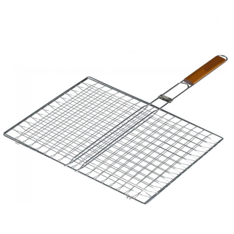 Грати для гриля виконані з високоякісної нержавіючої сталі. Вона має продуману ергономічну форму конструкцію з гарною стійкістю та двома ручками. На такій решеті чудово смажаться овочі, риба, м'ясо. Ґрати зручно брати з собою у будь-яку поїздку на природу, у багатоденні походи, і всюди, де планується пікнік. Вона легка, компактна, не займе багато місця і не стане тягарем навіть у пішому поході. Для її використання не обов'язковий мангал опору для неї можна спорудити з підручних засобів або обійтися без опори, адже ручка досить довга і захищена дерев'яною накладкою, так що можна не боятися обпекти руки. Догляд за нею дуже простий м'яка губка з миючим засобом допоможе позбавитися від залишків їжі.