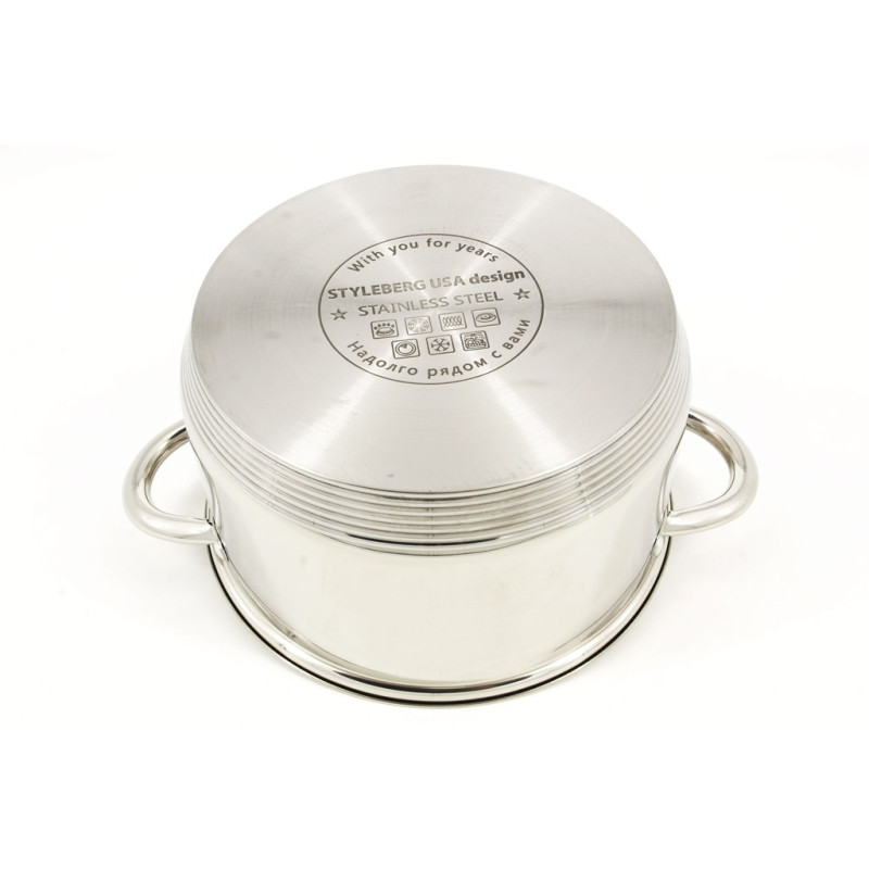 Каструля з нержавіючої сталі із капсульним дном. У комплекті йде скляна кришка з отвором для випуску пари. Ручки ергономічної форми виконані зі сталі, кріплення – клепкове (ручки не нагріваються). Стильний оригінальний дизайн, простота у догляді та використанні, екологічність та довговічність – ось відмінні риси даного посуду. Каструля має п'ятишарове дно.