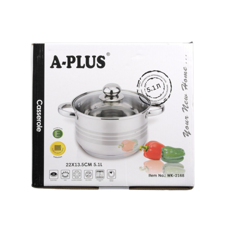 Каструля з нержавіючої сталі із капсульним дном. У комплекті йде скляна кришка з отвором для випуску пари. Ручки ергономічної форми виконані зі сталі, кріплення – клепкове (ручки не нагріваються). Стильний оригінальний дизайн, простота у догляді та використанні, екологічність та довговічність – ось відмінні риси даного посуду. Каструля має п'ятишарове дно.Розмір каструлі: 22 * 13,5