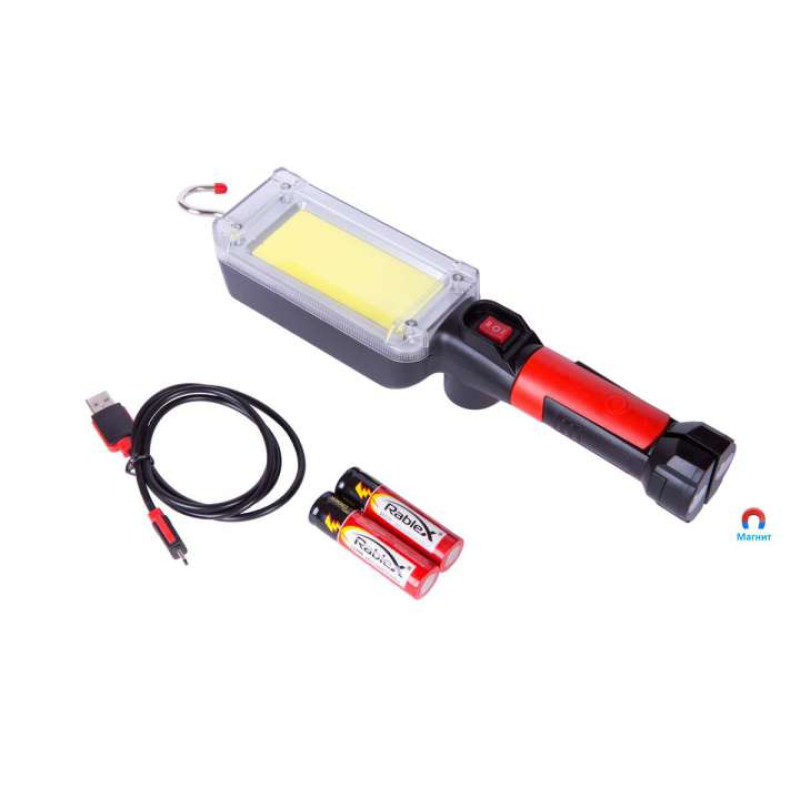 Автомобільна лампа з яскравою світлодіодною стрічкою має яскраве світло. Перевагою є робота лампи від 2шт акумуляторів типу 18650, наявності поворотного механізму, що дозволяє регулювати кут променя, та магніти на торці корпусу, що позоляє кріпити ліхтар на металеву поверхню, а також гачок у торцевій частині ліхтаря.Заряджається від шнура USB.