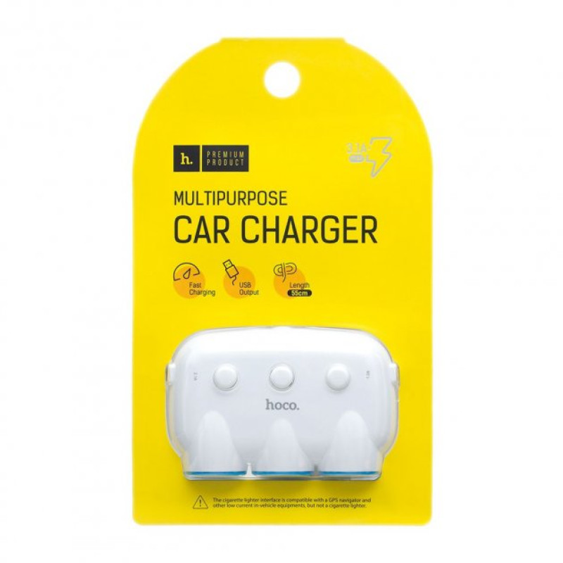 Автомобільна зарядка-розгалужувач Hoco C1 Three in one Car charger 3 гнізда, 2 USB виходи (Білий) – найкраще рішення для одночасної підзарядки кількох пристроїв під час поїздки в автомобілі.Є три гнізда та два USB виходи.
