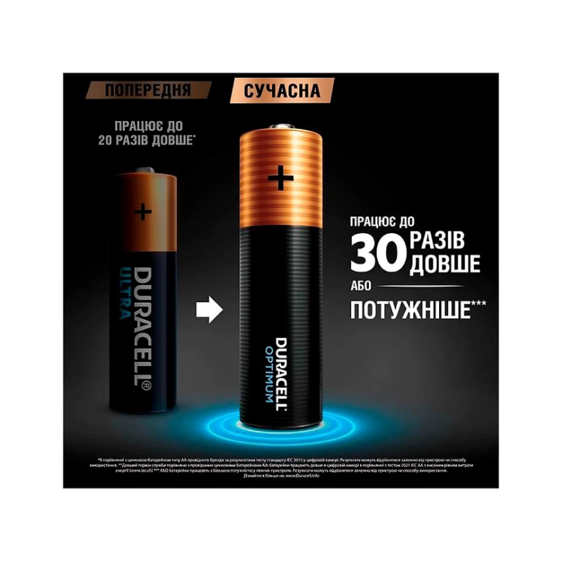 Duracell Optimum AA (LR6) – це інноваційні лужні батареї преміум-класу, що забезпечують більш високу потужність та триваліший термін роботи в порівнянні зі звичайними батарейками Duracell. Підходять для пристроїв із високим енергоспоживанням та для повсякденної техніки.Характеристики: