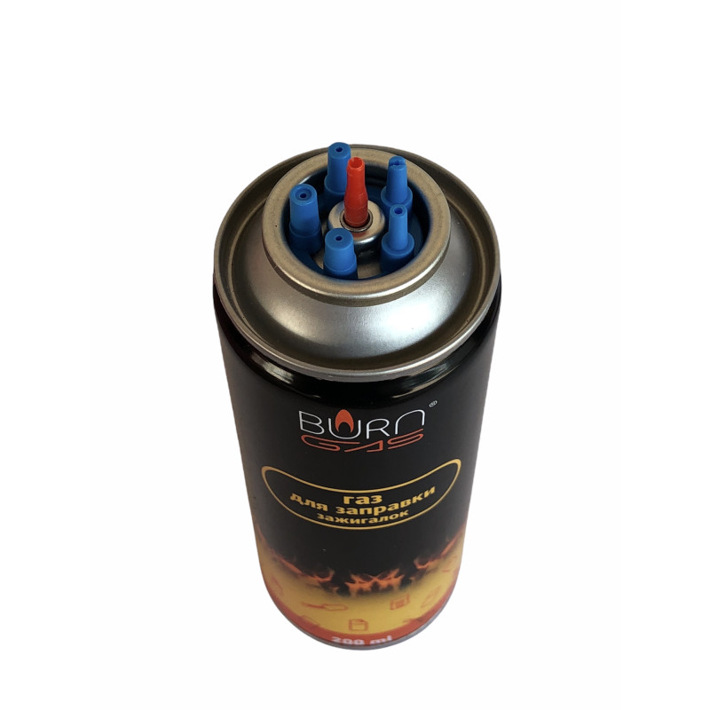 Газовый баллончик для заправки зажигалок горелок наполнен жидким газом изобутан высокой чистоты, имеет крышку с пятью присоединительными типами штуцеров для впускных клапанов 5-ти различных типов.Практически для всего спектра зажигалок не требуется установка дополнительных насадок. Зажигалки могут заполняться непосредственно от баллона.
