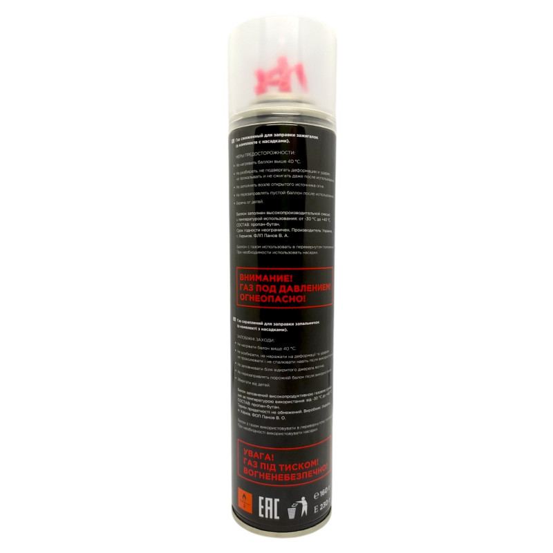 Газовий балон призначений для заправки всіх типів багаторазових газових запальничок, а також туристичних пальнків, які заправляються від такого типу балонів. Містить газову суміш пропану, бутану, ізобутану. Високий ступінь очищення газу забезпечує плавне та рівномірне полум'я.