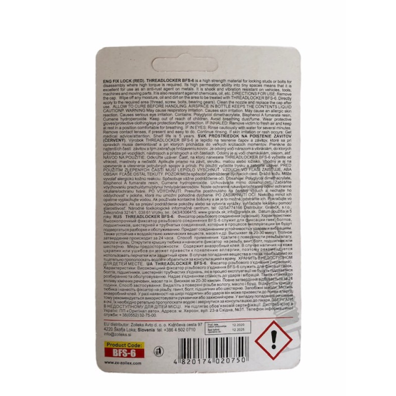 Забезпечує високу універсальність застосування BFS-6, наприклад, для болтових з'єднань в двигуні, трансмісії, підвіски, а також при складанні обладнання, пневматичних і електричних інструментів. Після закінчення полімеризації засіб Zollex BFS-6 набуває якісну стійкість до впливу вібраційних навантажень, а також води, бензину, масел, мастил та інших засобів хімії.