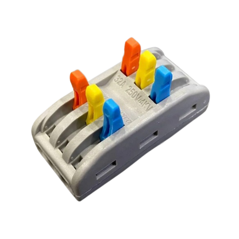 Клеми швидкого монтажу, двосторонні 3+3 - універсальні ізольовані клеми для підключення будь-яких типів мідних провідників: моножильних та багатожильних тонкодротяних.Затискач проводів здійснюється за допомогою помаранчевих важелів.
