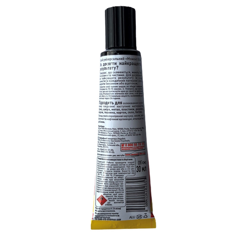 Контактний клей стійкий до впливу води, морозу, старіння, гарантує високу міцність склеювання. Служить для склеювання у різних комбінаціях гуми, шкіри, металів, пластиків, дерева, пробки, тканини, картону, скла, бетону, не придатний для склеювання стиропору, поліетилену, поліпропілену, пластифікованого ПВХ.