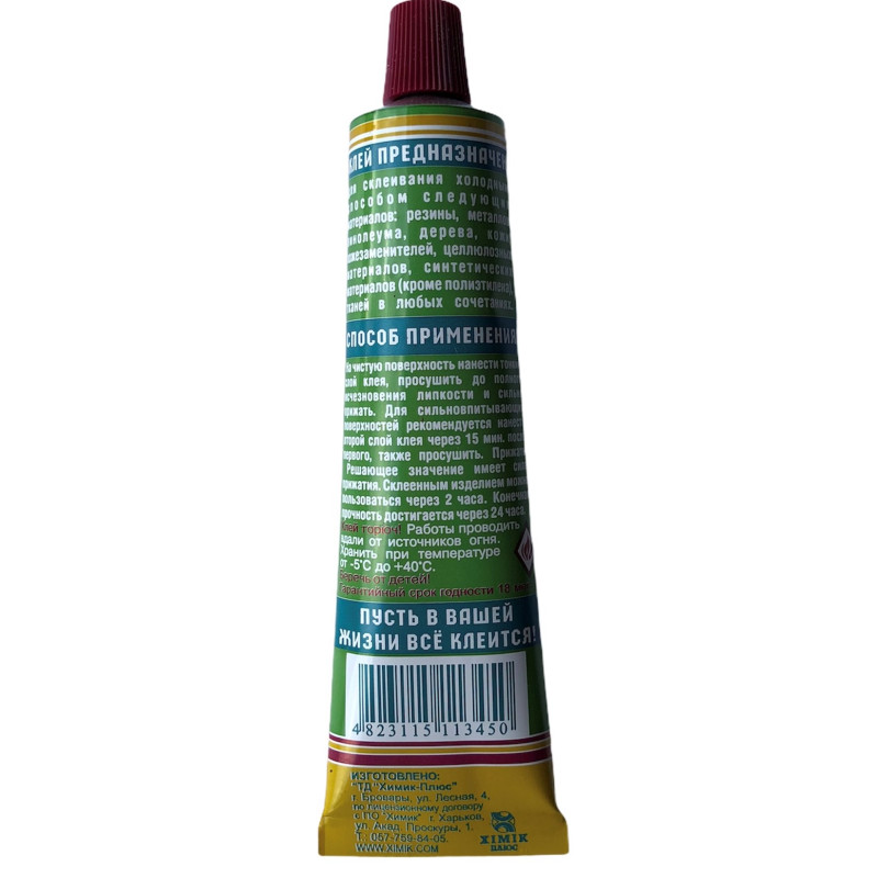 Контактний клей стійкий до впливу води, морозу, старіння, гарантує високу міцність склеювання. Служить для склеювання у різних комбінаціях гуми, шкіри, металів, пластиків, дерева, пробки, тканини, картону, скла, бетону, не придатний для склеювання стиропору, поліетилену, поліпропілену, пластифікованого ПВХ.