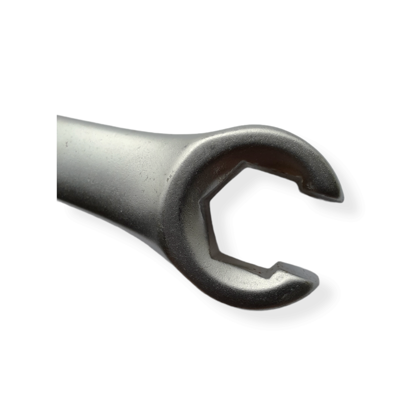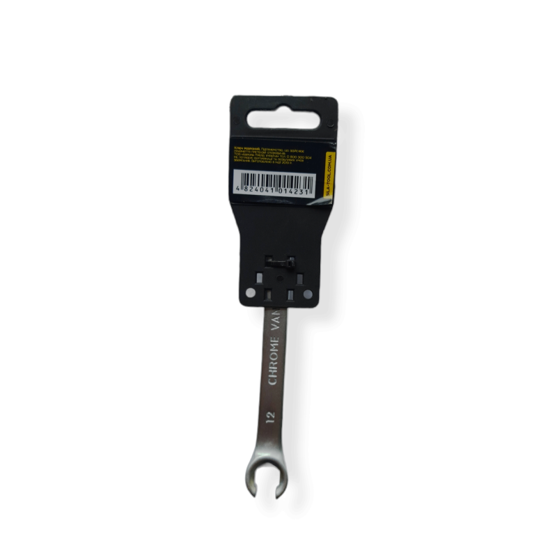 Двосторонній накидний ключ з розрізом, завдяки чому має відкритий зів С-образної форми.Предназначен для роботи з трубопроводами. Матеріал: хром-ванадієва сталь.