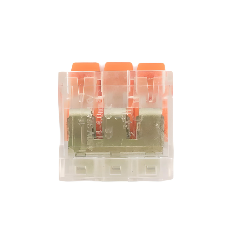 Є корисним і зручним монтажним пристосуванням для з'єднання електропроводів між собою. Виріб має прозорий корпус, а фіксуючі важелі пофарбовані в оранжевий колір. Клема самозажимна застосовується і при нарощуванні електрокабеля, що має інший перетин або виконаного з іншого матеріалу. У своїй конструкції клеммник має три важелі для фіксації проводів, за допомогою яких можливо вільно з'єднувати або роз'єднувати контактні пари. Виготовлена клема з'єднувальних з міцного вогнетривкого пластифікатора, який витримує різні зовнішні чинники навколишнього середовища.