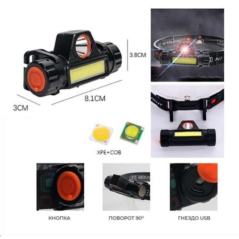 Налобний ліхтар із центральним яскравим світлодіодом відмінно підійде для кемпінгу та туризму, полювання, риболовлі, велопрогулянки. Буде вірним помічником у будь-якому виді діяльності у темний час доби.Режими роботи: 3 (верхні діоди та стрічка COB). Живлення від вбудованого акумулятора може використовуватися як налобний або кишеньковий ліхтар (відстібається налобна кліпса).