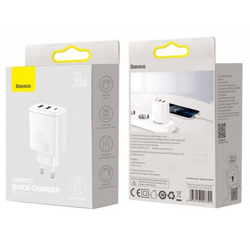 Заряджайте одразу три пристрої від однієї розетки завдяки Baseus Compact Quick Charger 2U+C 30W EU. Зарядний пристрій оснащений двома вихідними USB портами і одним USB Type-C. Швидкість заряджання в 3 рази вище, ніж у стандартного адаптера. Швидка зарядка до 50% всього за 30 хвилин без ризику перегріву, короткого замикання або пошкодження акумулятора. Корпус виготовлений з полікарбонату, який не перегрівається та забезпечує тривалий термін служби. А його глянцева структура захищатиме пристрій від подряпин та відбитків пальців.