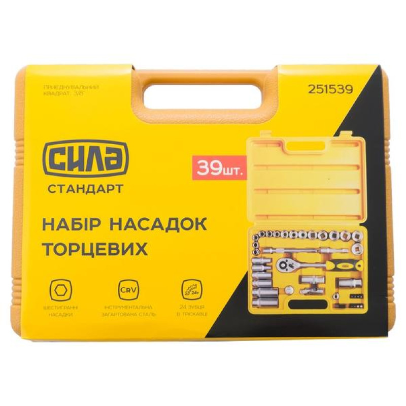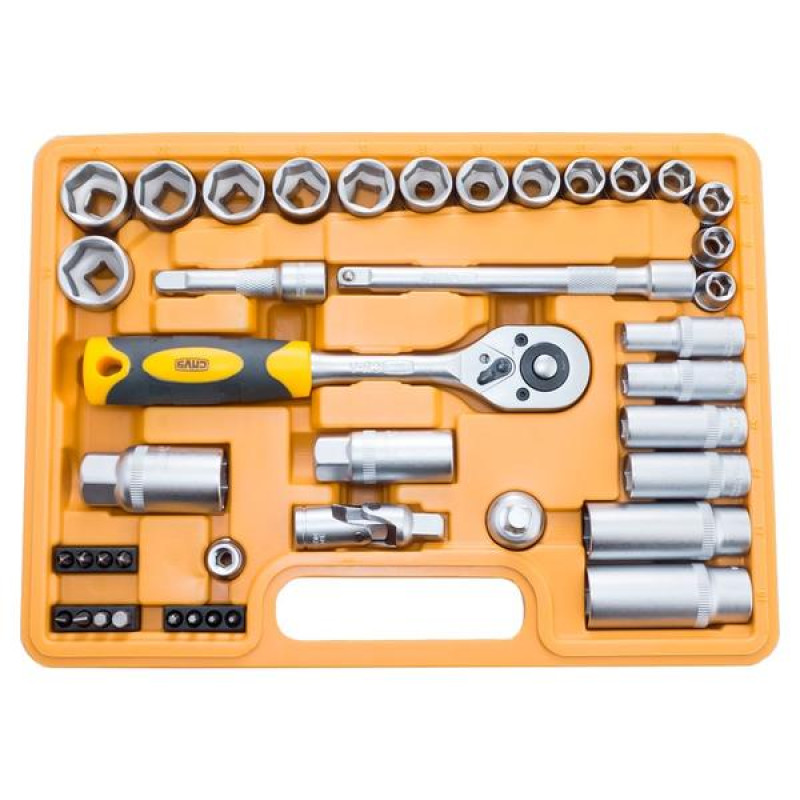 Набір інструментів і торцевих насадок з тріскачкою в зручному пластиковому кейсі призначений для роботи з різними різьбовими з'єднаннями. Механізм рукоятки храповий з реверсом.Вороток Т-подібний.