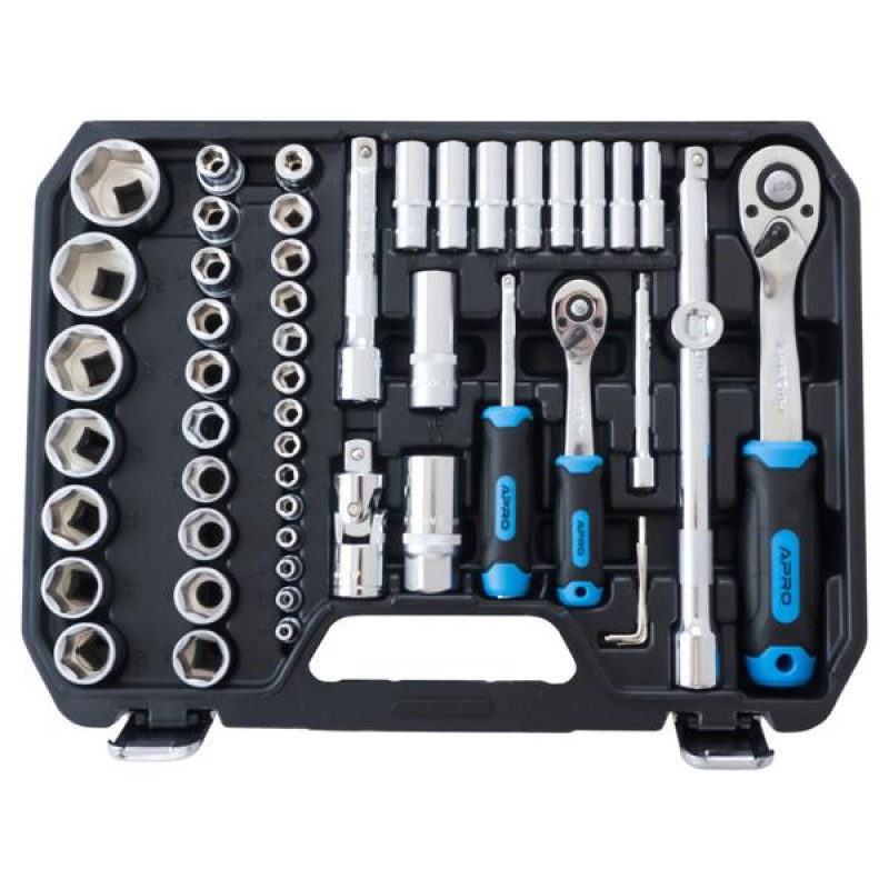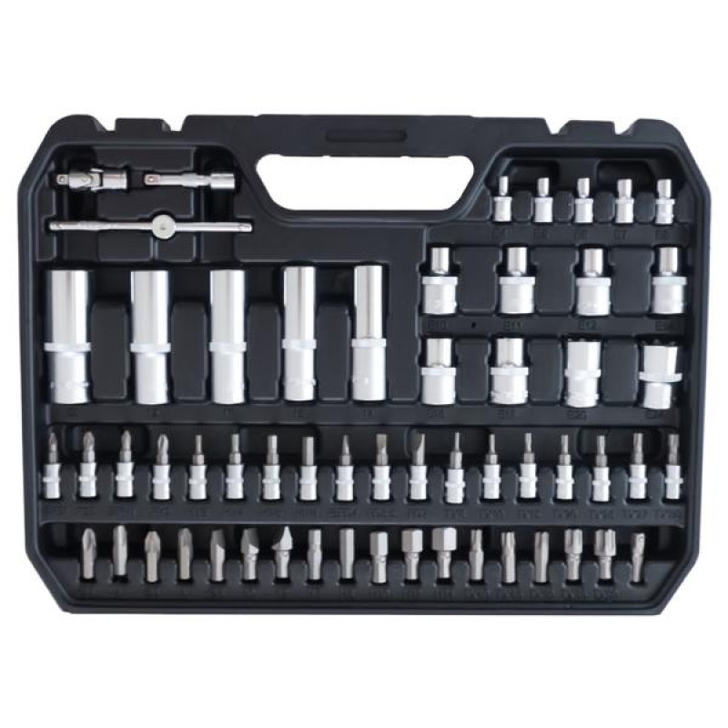 Набір інструментів і торцевих насадок з тріскачкою в зручному пластиковому кейсі призначений для роботи з різними різьбовими з'єднаннями.☑Вороток Т-подібний.