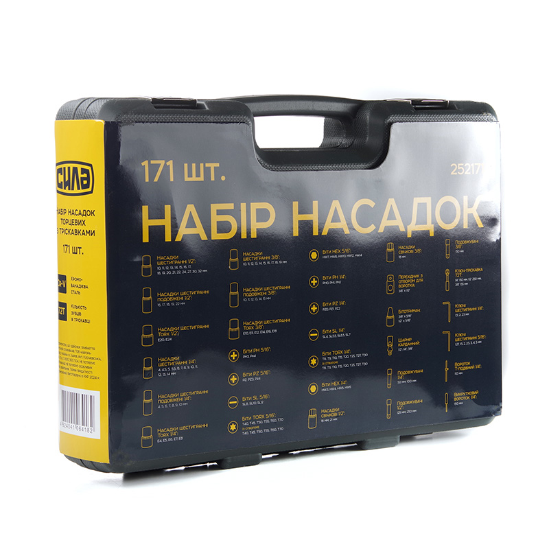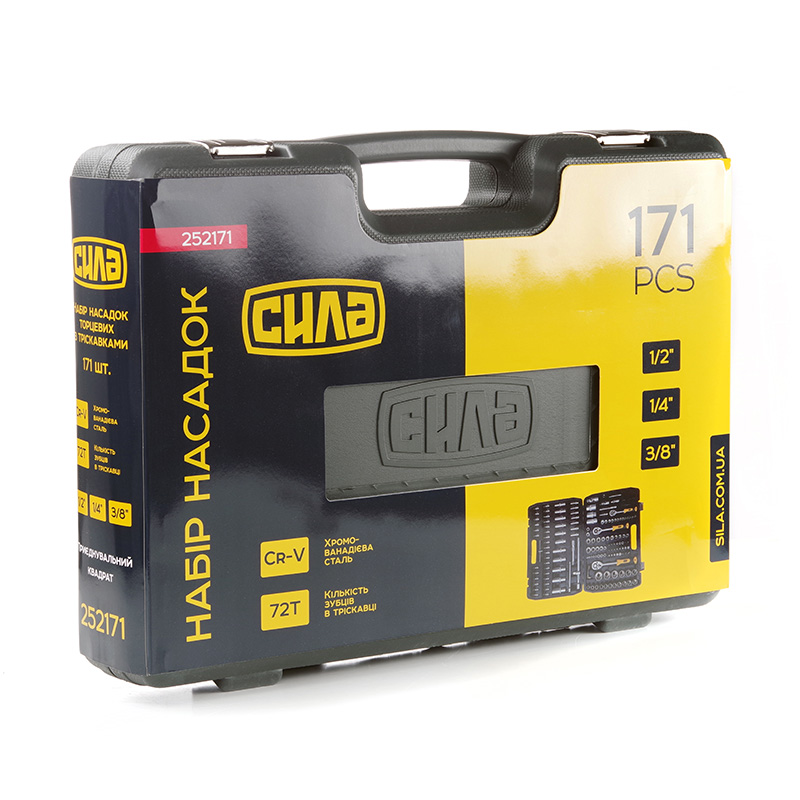 Набір від СИЛА включає 171 одиницю високоякісних інструментів з трьома розмірами приєднувальних квадратів: 1/4", 3/8" та 1/2". Три тріскавки з 72 зубами забезпечують максимальну ефективність та зручність роботи з кріпленнями будь-яких розмірів. Набір виготовлений з міцної хром-ванадієвої сталі, гарантуючи надійність та довговічність.Переваги набору: