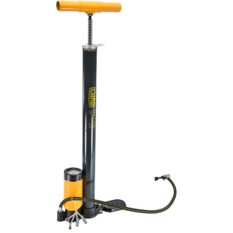 Ручний насос обладнаний швидкозажимним клапаном і одним поршнем.В комплекті адаптер для автомобільних шин.Вироблен з металу.Дана модель обладнана манометром і ресивером.