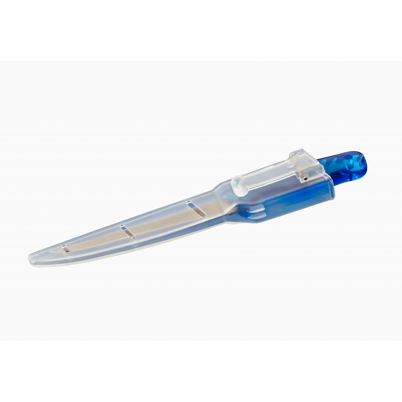 Рукоятка ножа виготовлена з кольорового акрилу, що є сучасним гігієнічним матеріалом. Варто відзначити дуже цікавий дизайнерський хід – рукоять ножа має прозору структуру, крізь яку видно хвостовик ножа, стилізований під риб'ячий хребет. У комплект поставки ножа входять пластикові ножни з підпружиненою кліпсою, за допомогою якої піхви можна закріпити на поясі або іншому спорядженні.