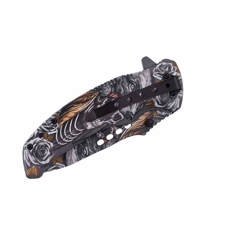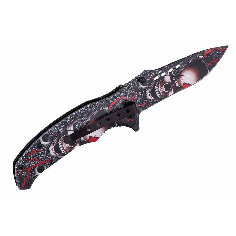 ✅Поверхня ножа повністю покрита якісним зображенням Aquaprint із деталізованим малюнком. Тематика — темно-готична, що надає моделі впізнаваного, трохи агресивного стилю. Вдалий вибір для тих, хто цінує оригінальний вигляд.