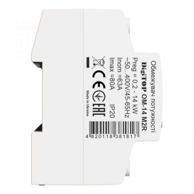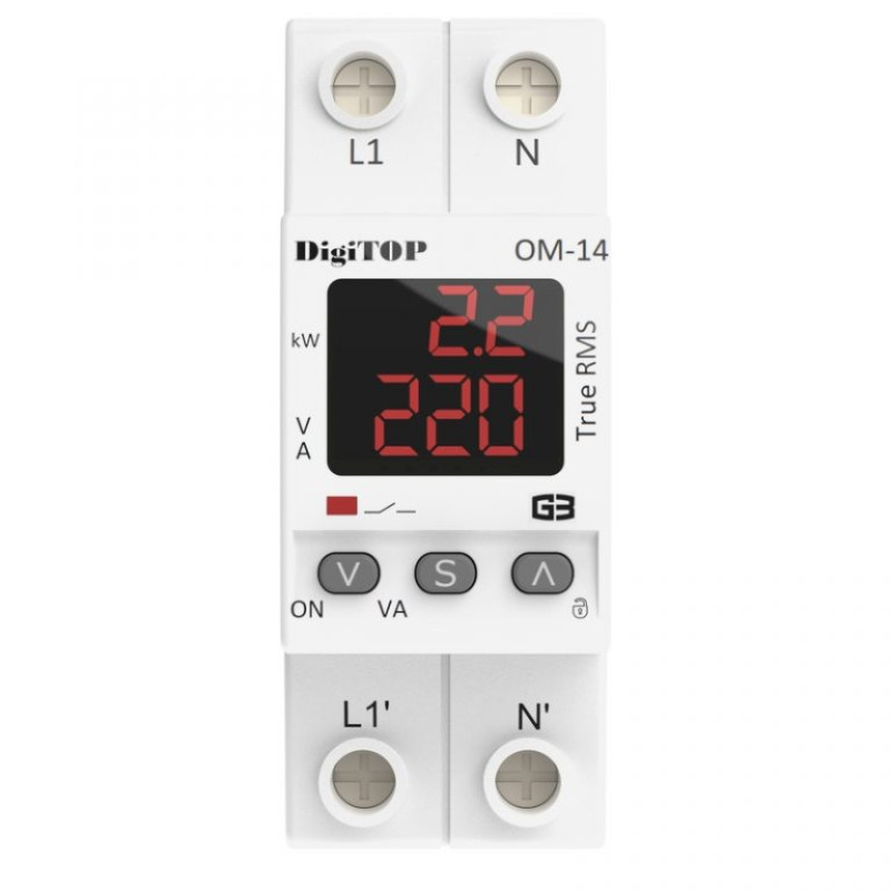 Обмежувач потужності ОМ-14 M2R призначений для контролю споживаної потужності в однофазній електричній мережі. Прилад керується мікроконтролером, який аналізує напругу в електромережі, струм, що споживається, і обчислює потужність підключеного навантаження з відображенням значень на цифрових індикаторах.