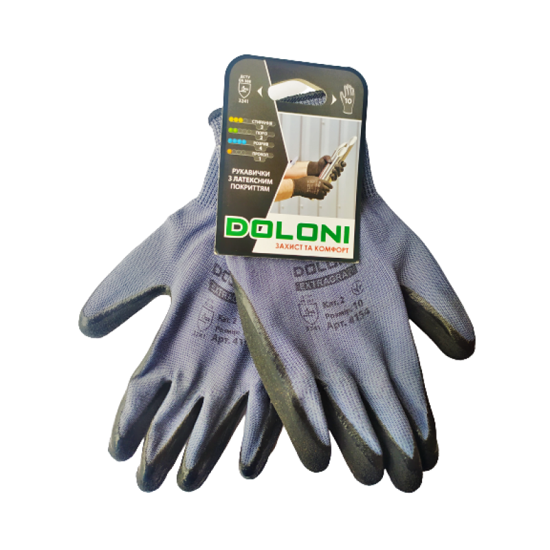 Doloni 4154 – це трикотажні захисні рукавички з нітриловим покриттям. Застосовуються для робіт з оліями, лаками, фарбами. Мають відмінне зчеплення на промаслених поверхнях. Стійкі до розривів та стирання.Щільно облягають руку та забезпечують хорошу чутливість пальців. Еластична манжета зроблена гумкою та захищає рукавичку зсередини від попадання різних речовин.