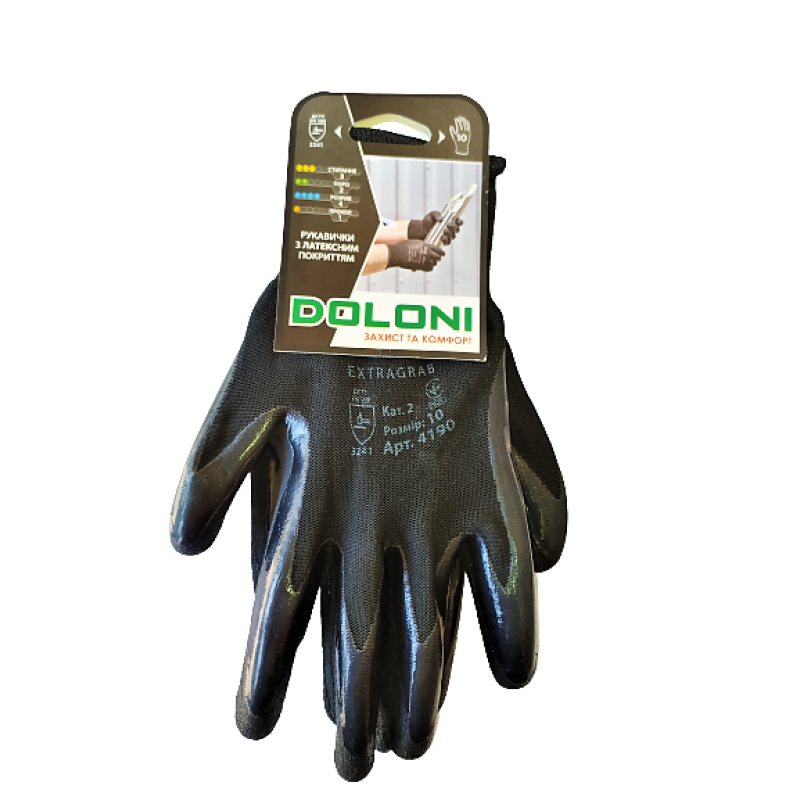Doloni 4190 – це обливні рукавички з латексним покриттям. Використовуються для роботи зі слизькими поверхнями. Латекс має властивість добре спінюватися, чим створює рельєфну структуру на рукавиці для запобігання ковзанню. Еластичний, тому рукавиці міцні і немає скутості рухів. Спеціальний манжет перешкоджає попаданню дрібного сміття всередину, тим самим захищає кисть. Використовуються як рукавички для бензопили, для роботи з болгаркою. Часто такі рукавички називають - рукавички муляра або рукавички скляра.!Латекс руйнується при взаємодії з тваринами, рослинними жирами та мастилами!