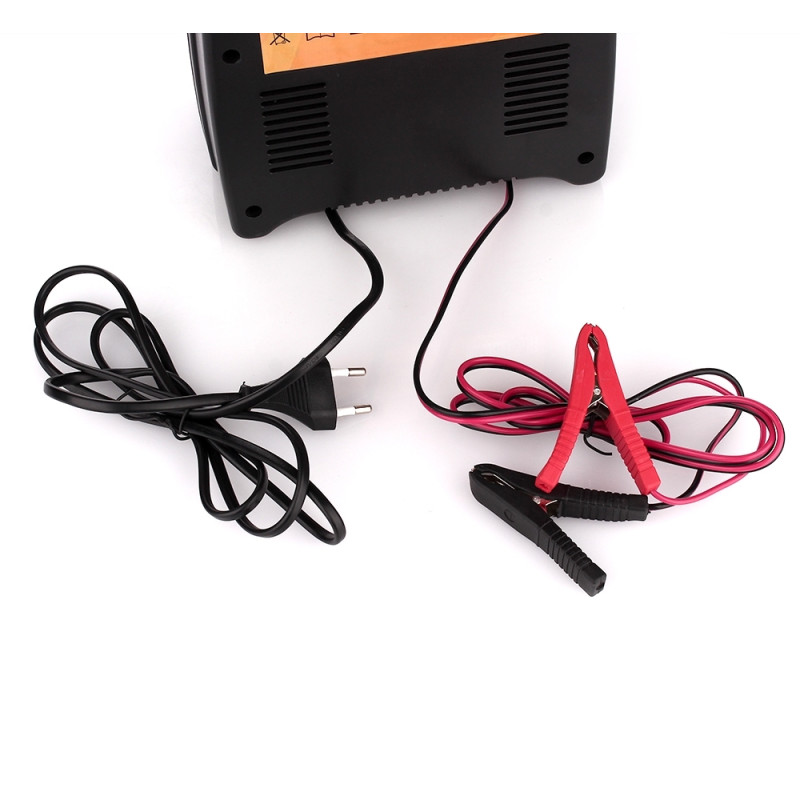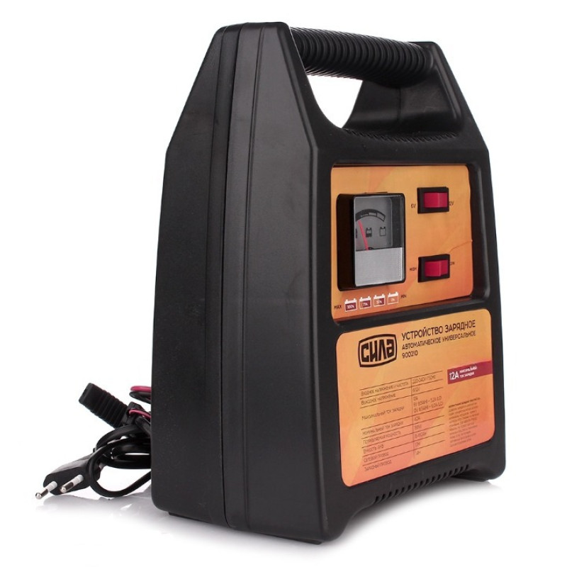 Пристрій для заряджання акумуляторної батареї автомобіля. Підключення здійснюється за допомогою затискачів-крокодилів. Пристрій працює в двох режимах, 6 вольт і 12 вольт, що дозволяє використовувати його як для зарядки автомобільних, так і для мото акумуляторів. На верхній панелі є вентиляційні отвори для пасивного охолодження.