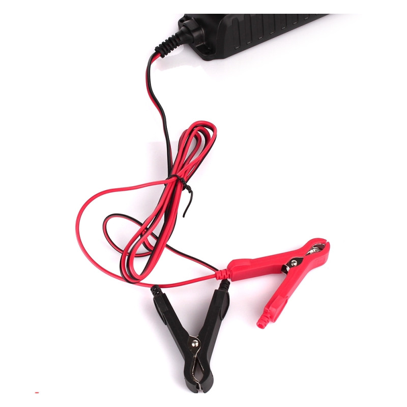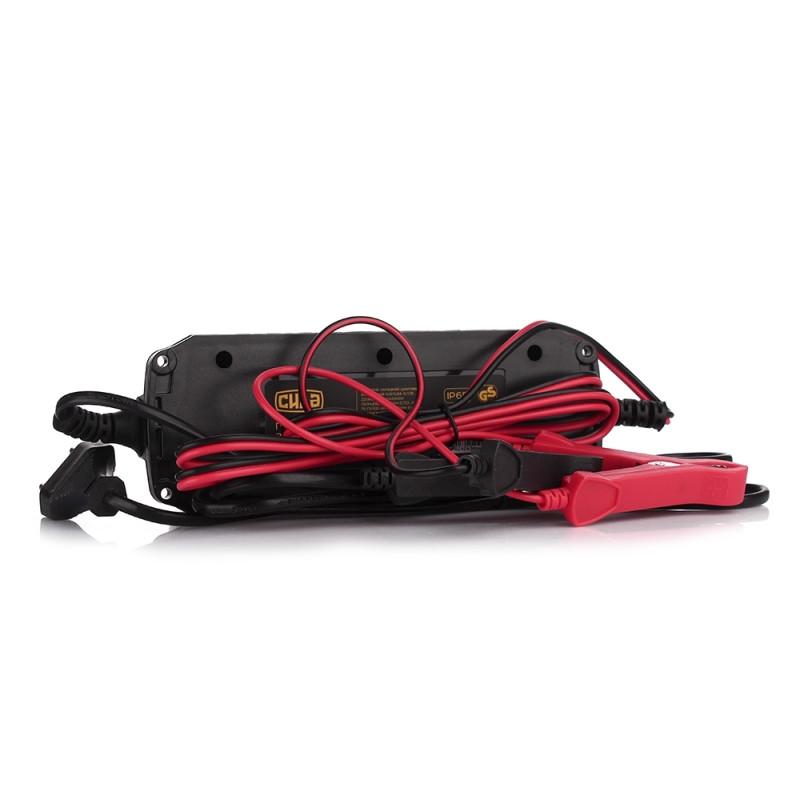 Пристрій для заряджання акумуляторної батареї автомобіля. Пристрій сумісний як зі звичайними свинцево-кислотними, так і з сучасними AMG, GEL акумуляторами. Підключення до клем акумуляторної батареї здійснюється за допомогою затискачів-крокодилів, що мають ізоляційні ручки для безпечного монтажу. Є захист від перегріву та короткого замикання.