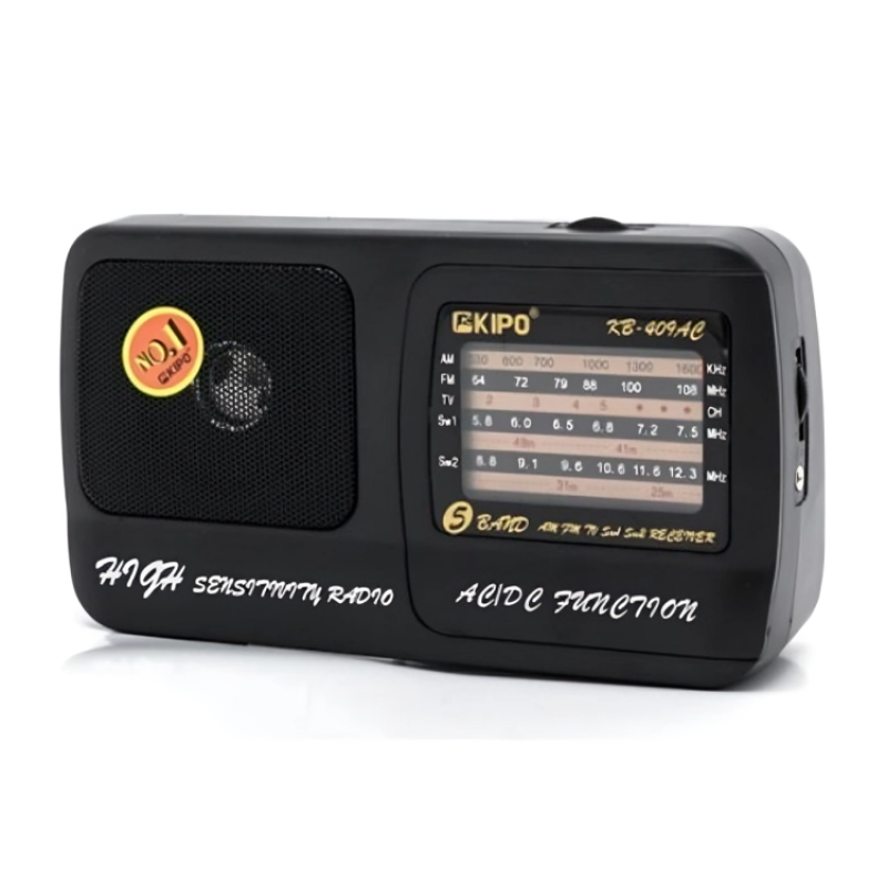 KIPO KB 409AC - це радіоприймач, який працює в 5 діапазонах - AM/FM/TV/SW1-2 За допомогою цього портативного пристрою Ви можете насолоджуватися музикою на природі, вдома, на дачі! Є вихід під навушники.Для живлення тут використовується або електромережа 220В, або 2 батареї. Довга телескопічна антена забезпечує якісний прийом радіостанцій. Відкидна ручка призначена для перенесення радіо.