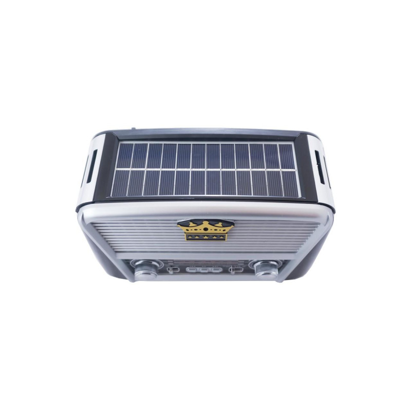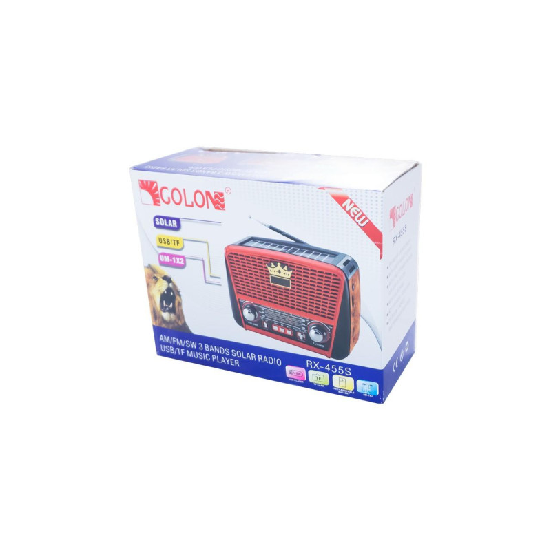 Радіоприймач Golon RX-456S Solar - 3-х хвильовий радіоприймач-колонка на сонячних батареях, з ліхтариком, аналоговим тюнером. Приймач працює на хвилях FM, AM, SW. Відтворює музику з USB флешок. У комплекті є ремінь через плече.Працює RX-456S Solar від вбудованого акумулятора, який може заряджатися від мережі 220V, або від сонячних батарей, вбудованих у верхню панель приймача. Від акумулятора, без заряджання працює до 6 годин, час роботи залежить від гучності. На світлі Golon-456 постійно заряджає вбудований акумулятор від сонячних панелей, час повної зарядки акумулятора від них близько 10 годин. Приймач Golon RX-456S Solar відтворює музику через 1 динамік, приймає діапазони FM 87,5-108 МГц, середні хвилі AM 530-1710 кГц, короткі хвилі SW 9-16 МГц.
