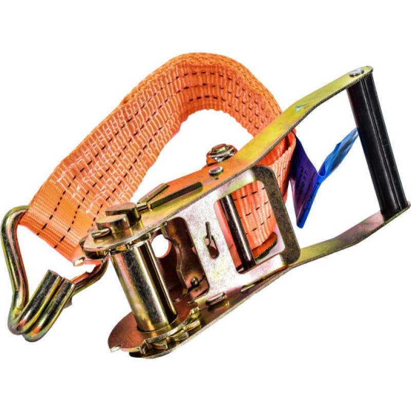 Ремінь стяжний дозволяє надійно утримувати вантаж який перевозиться транспортним засобом. На ремені храповий замок з двома гаками. Матеріал: метал, поліестер.
