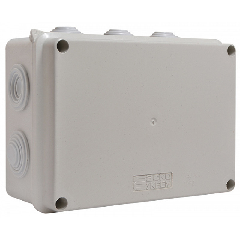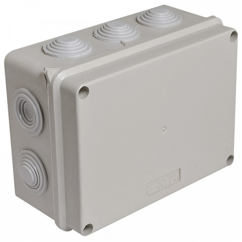 Розподільна коробка призначена для розгалуження кабелів та проводів. Містить елементи кріплення для установки клемних колодок і вбудовані гумові сальники - гермовводи. Матеріал: ПВХ.Розмір: 150*110*70 мм