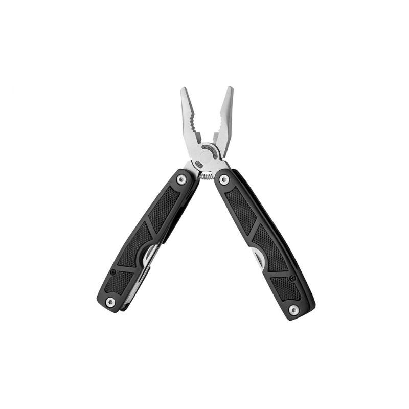 Мультитул 59068 – это удобная вещь и набор различных инструментов. Его полые ручки, в которых спрятаны все эти инструменты, имеют противоскользящее покрытие и пластиковые вставки, придающие им большую цепкость и служащие демпфером. Основной корпус и ручки мультитула – черного цвета, плоскогубцы – сатинированная сталь.В арсенал инструментов мультитула входят: