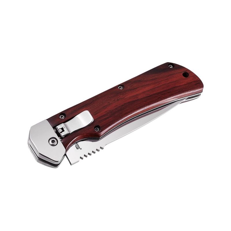 Выкидной нож 1314 c автоматической системой Lever Lock, функционально-декоративными накладками из темного дерева и интересным по форме клинком.Преимущества автоматического ножа 1314: