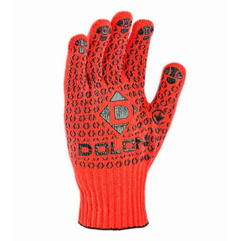 Doloni - це трикотажні безшовні рукавички з ПВХ малюнком. Армуюче полівінілхлоридне покриття забезпечує гарне зчеплення з поверхнею, що допомагає міцніше утримувати слизькі предмети і зменшує навантаження на руки. Рукавички ПВХ робітники забезпечують захист кистей рук та області зап'ясть від механічних пошкоджень та забруднень. Чим більша сумарна площа ПВХ напилення, тим виріб міцніший. Таке спеціальне покриття продовжує термін служби рукавиць, вони менше протираються та оберігають руки від пошкоджень.