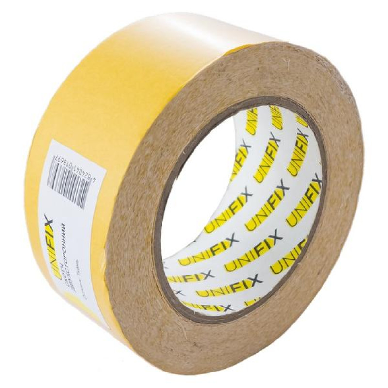 Двосторонній скотч тканинний UNIFIX є скотч, покритий з обох сторін тонким клейовим шаром. Використовується для надійного приклеювання ковроліну, плиток, з'єднання між собою нерівних поверхонь на тимчасовий або тривалий період. Дуже часто застосовується в процесі проведення покрівельних, ремонтно-оздоблювальних, монтажних робіт.Утримує предмети у всіх площинах завдяки тканинній основі. Є хорошою альтернативою клейовим розчинів.