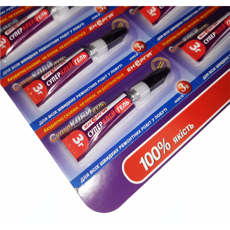 Прозорий клей для склеювання більшості міцних матеріалів і тканин в різних поєднаннях. Ефективний для склеювання пластмас, кераміки, порцеляни, дерева, щільного картону, шкіри, гуми і навіть скла і металів. Після нанесення клей не стікає, забезпечуючи можливість склеювати вертикальні і пористі поверхні.