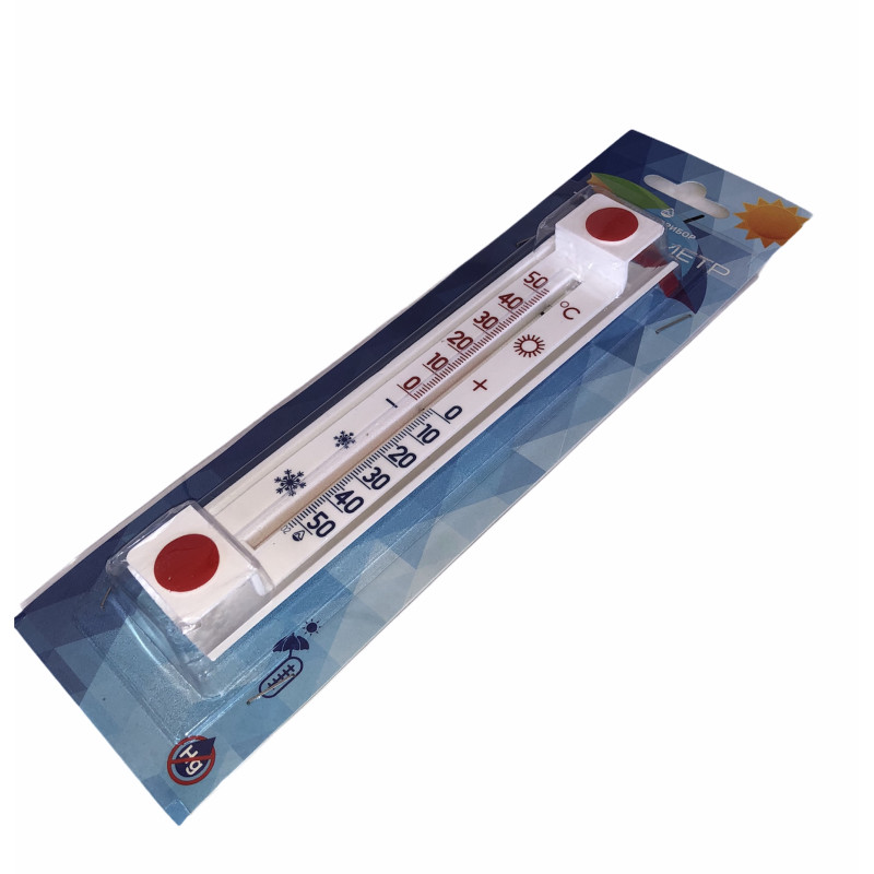 Вуличний віконний термометр для вікон в водозахищеного корпусі. Показує температуру повітря на вулиці. Кріпиться на раму вікна з боку вулиці на будь-яку сторону вікна. Виконано в пластиковому корпусі з липкими тримачами. Діапазон температури від -50 ° C до +50 ° C.