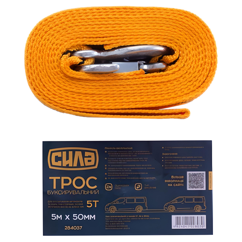 Трос стрічкового типу. На даній моделі з обох кінців розташовуються металеві карабіни, які забезпечують жорстке зчеплення. Здійснювати буксирування транспортного засобу можна як при гнучкому, так і жорсткому зчепленні.