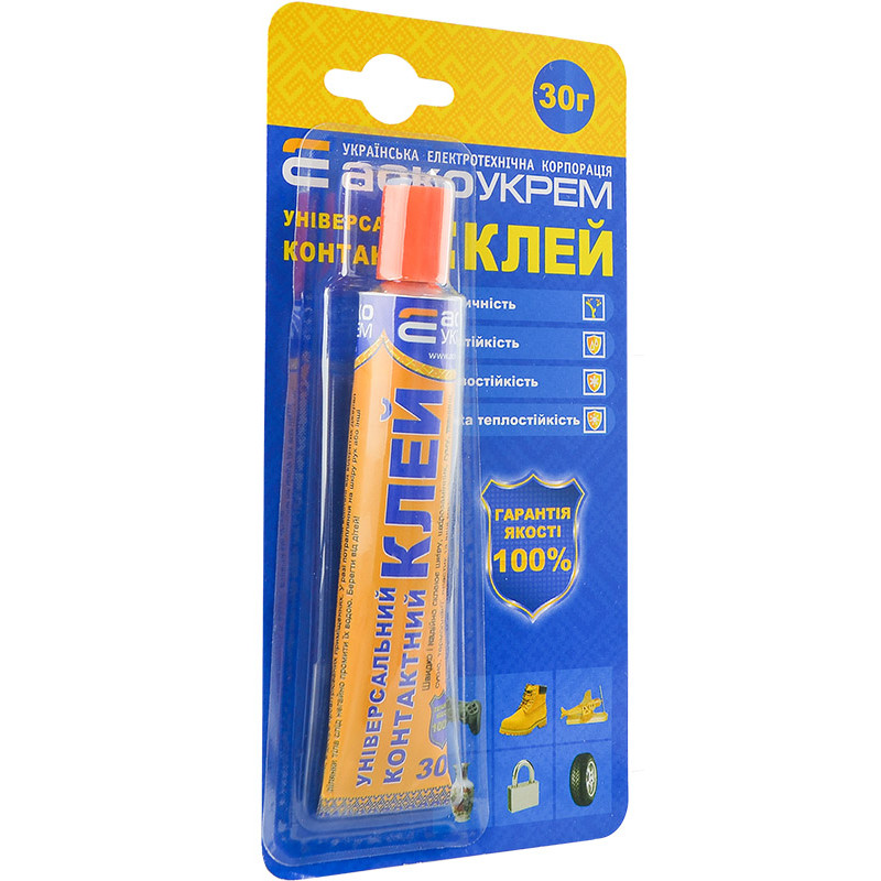 Універсальний Контактний клей склеює більшість матеріалів. Клейовий шов міцний, еластичний, водостійкий. Стійкий до старіння, впливу високої температури і слабких розчинів кислот і лугів. Склеює метали, шкіру, гуму, тканину, дерево, скло, кераміку, більшість пластиків.