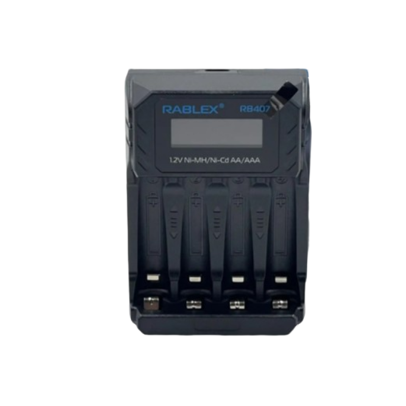 Rablex RB407 – це сучасний 4-слотовий зарядний пристрій з LCD-дисплеєм, призначений для заряджання акумуляторів формату AA та AAA. Підходить для нікель-метал-гідридних (Ni-MH) та нікель-кадмієвих (Ni-Cd) акумуляторів.Особливості:
